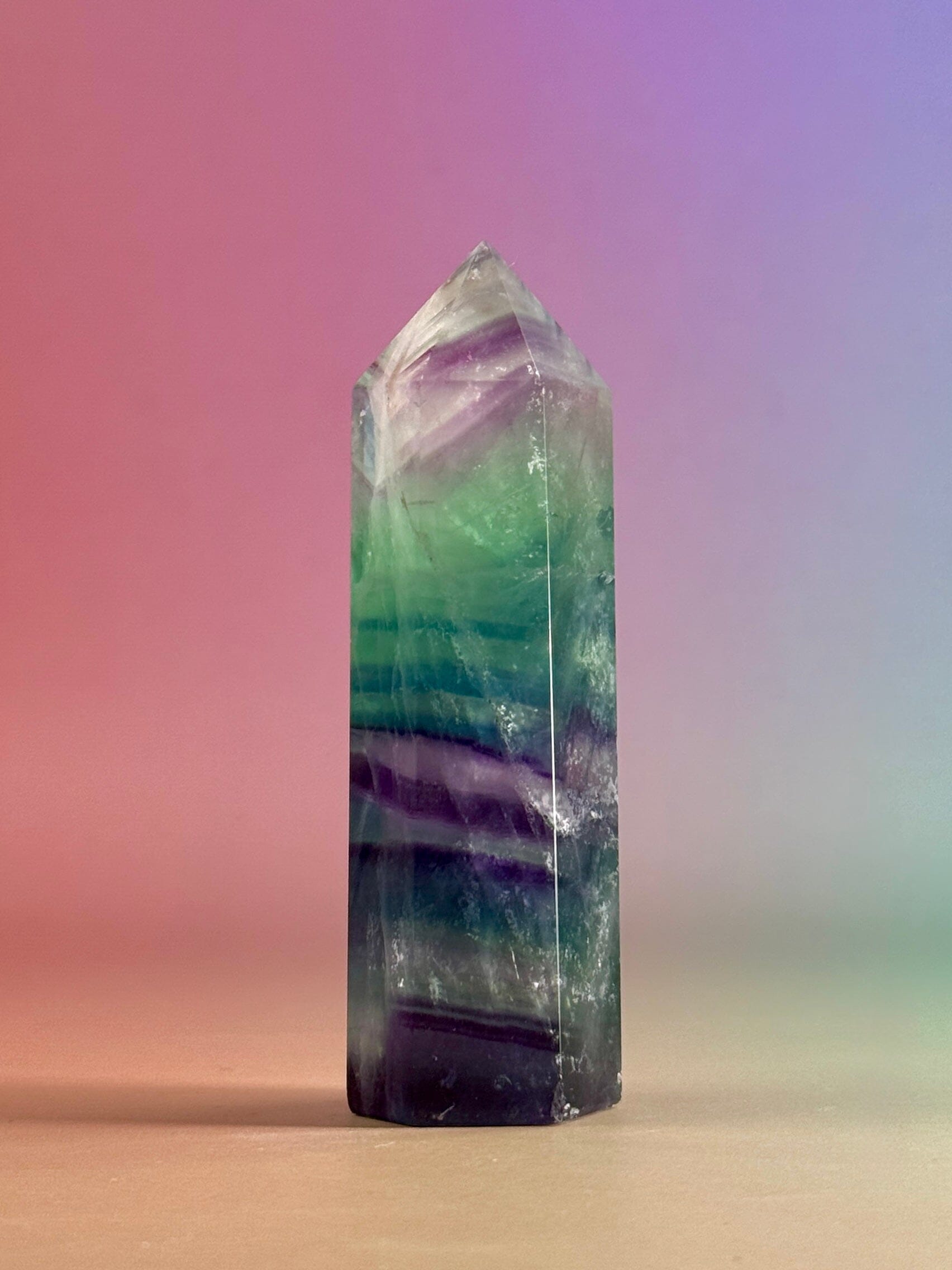 Rainbow Fluorite tower in beautiful and unique colors. This tower is of very high quality with stunning details.