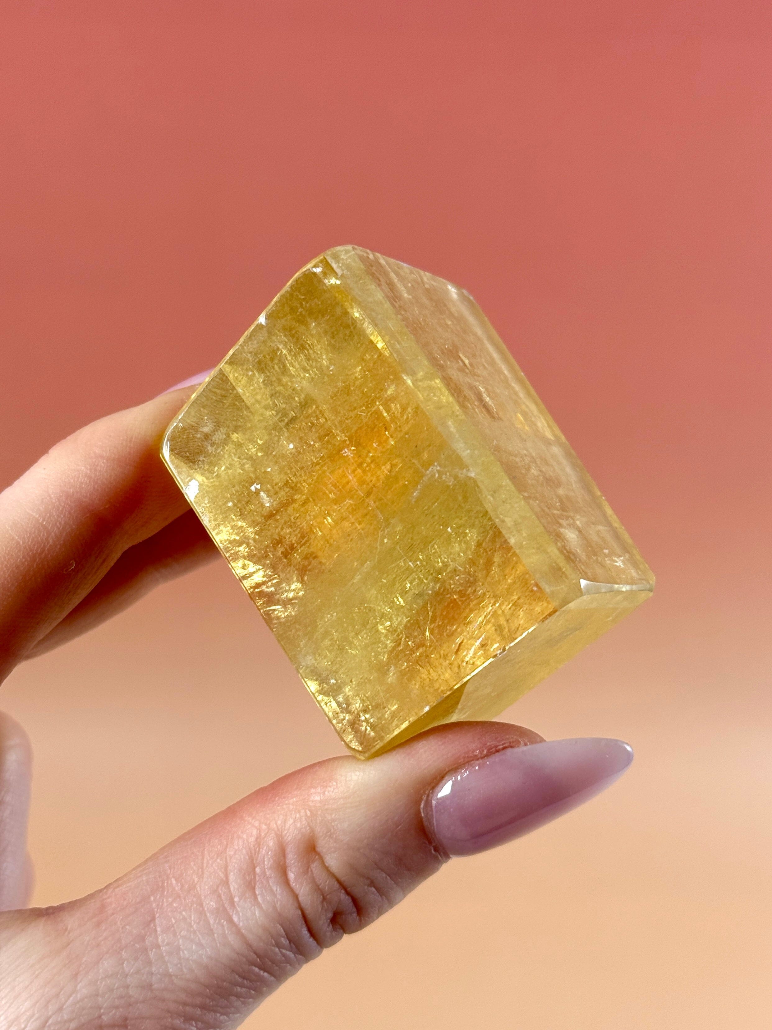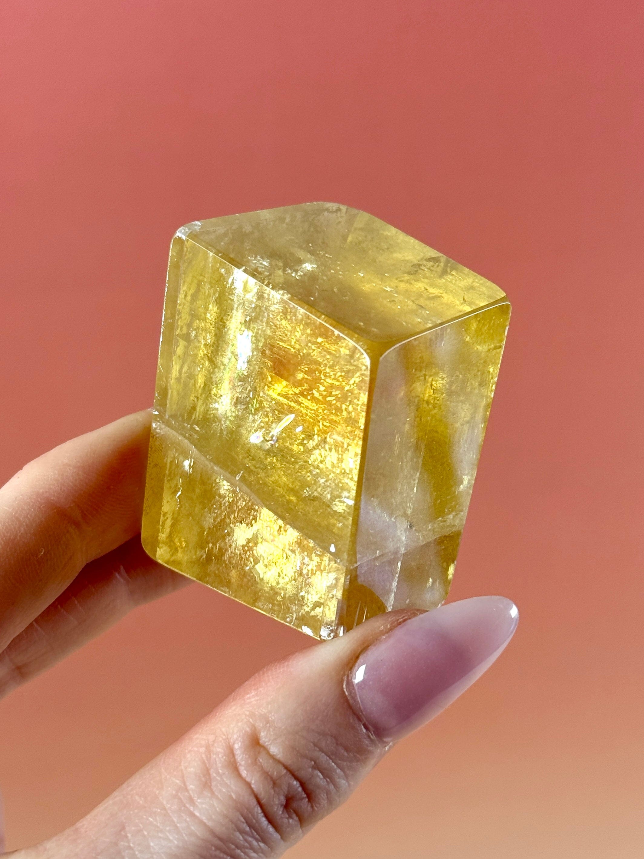 Optical Calcite is also known as Iceland Spar, and was originally discovered in Iceland, hence its name. It is a transparent form of Calcite, which often displays beautiful rainbows that flash in the light. It also displays the rare property of double refraction, so when placed over text, some pieces will show double the image, slightly offset. This beautiful crystal is most often seen in a colourless form, but it also forms in pink, peach, yellow and green tinged crystals.