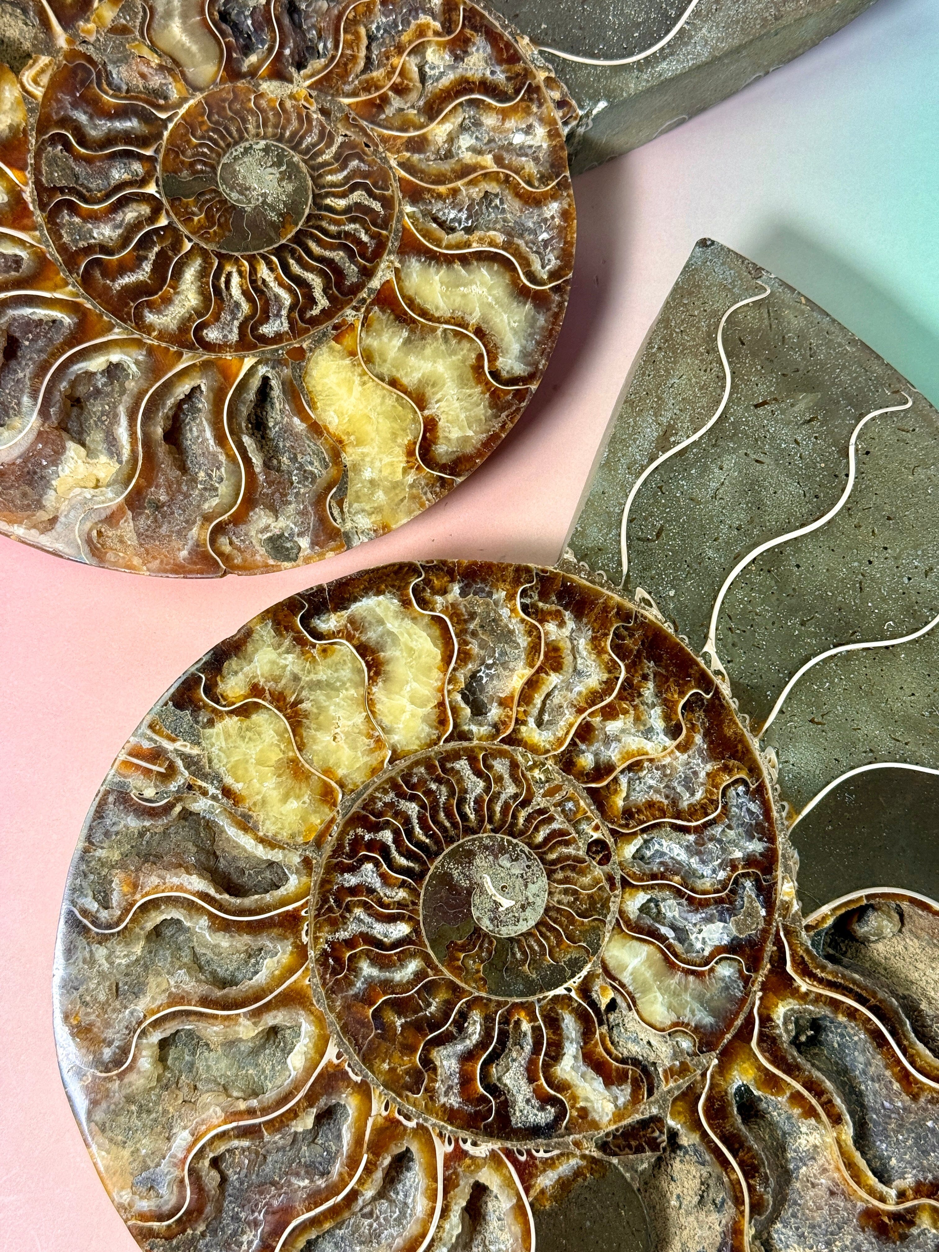 Ammonites contain ancient life force energy and have been used as meditation trinkets for centuries. These creatures lived in a very different world that had higher oxygen levels in the atmosphere, allowing for the creation of large animals.