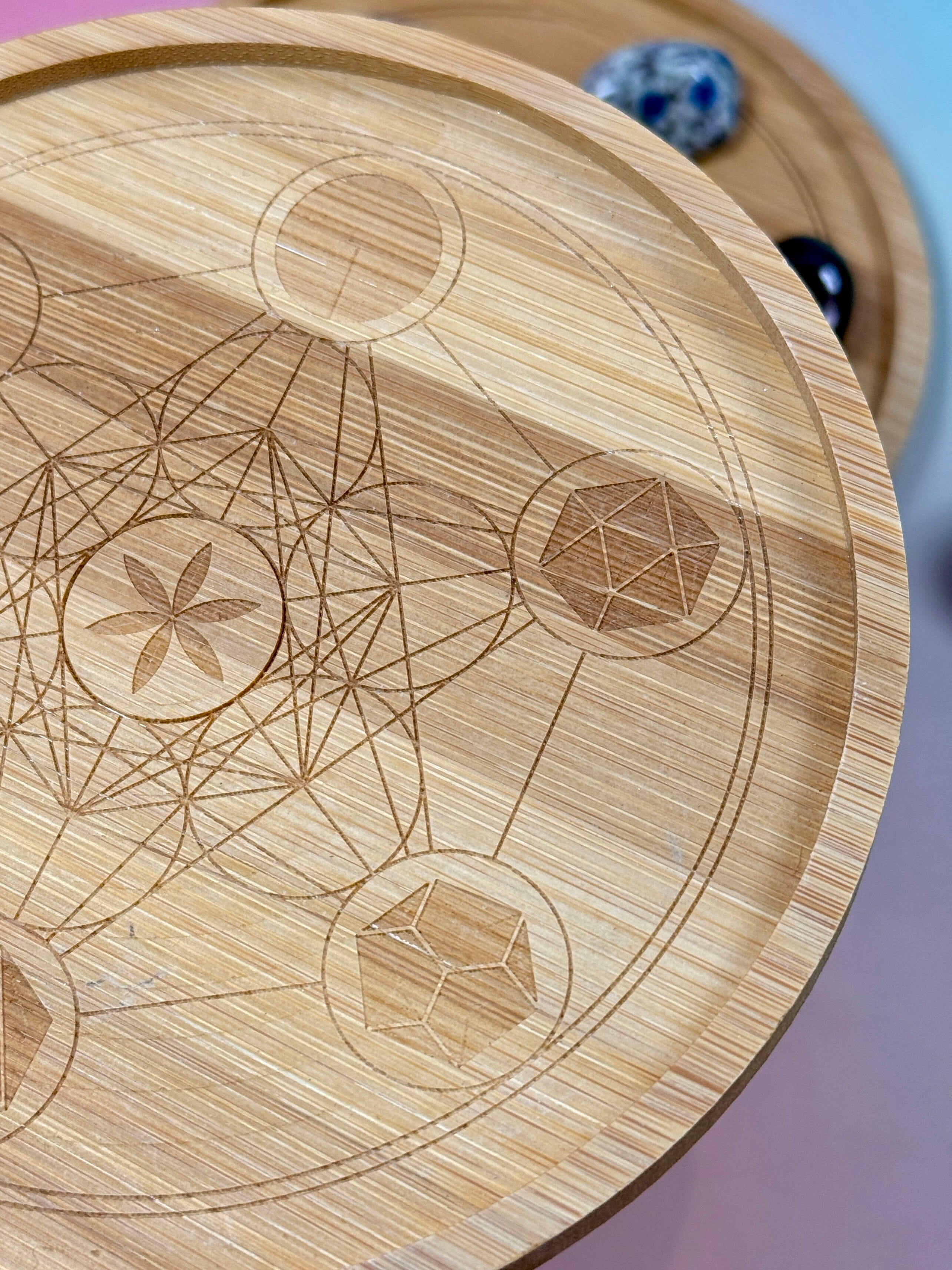 This round bamboo tray is engraved with the powerful sacred geometry symbol Metatron’s Cube, representing the structure of the universe, balance, and energetic protection. Containing all the Platonic solids, this symbol is traditionally used for energy work, clarity, and conscious manifestation.