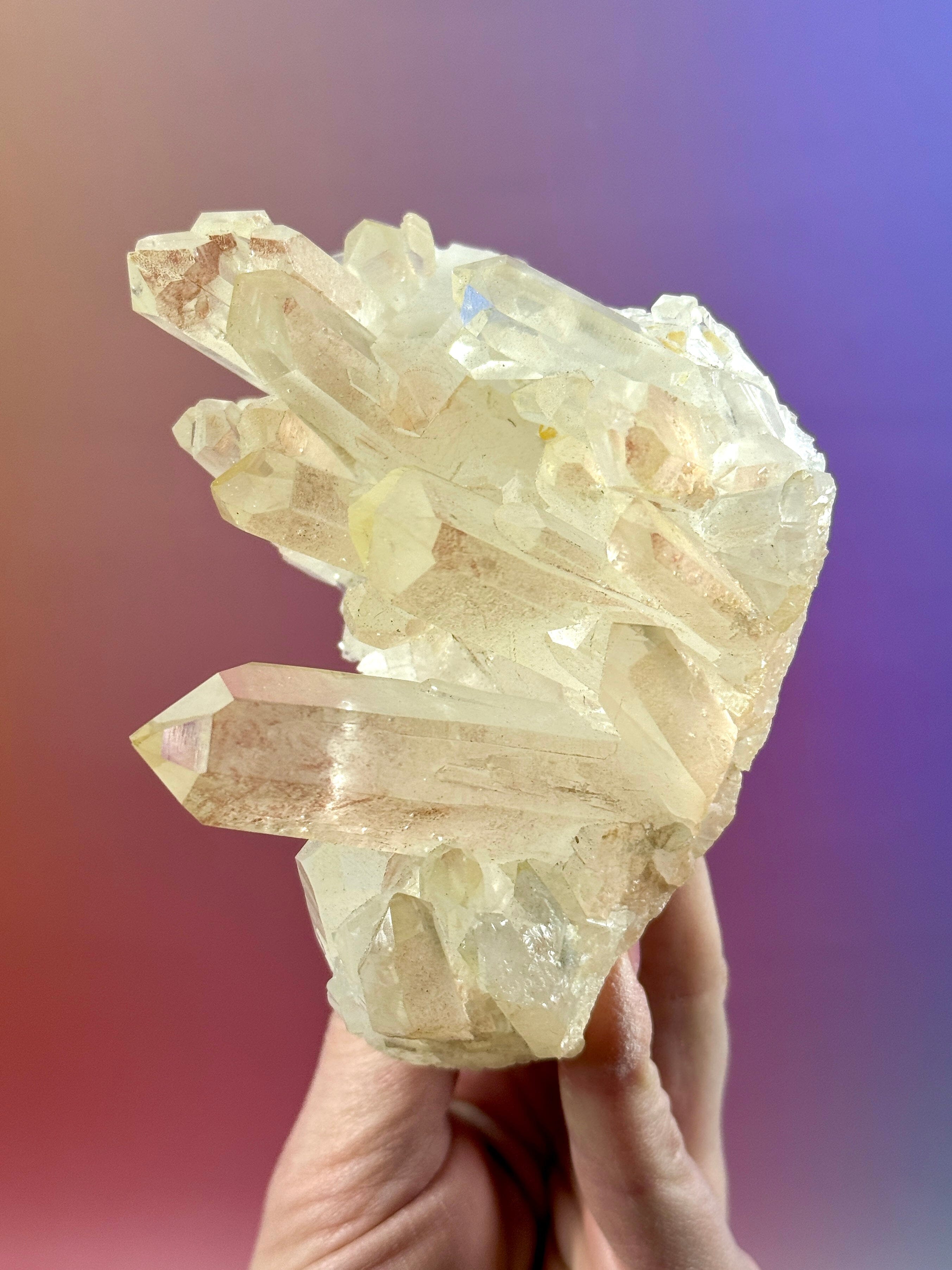 This Pink Hematoid Quartz Cluster from Madagascar is naturally coloured by a hematite coating, creating soft blush pink tones with occasional warm yellow and peach hues. Each cluster is unique, displaying beautiful rainbows, subtle hematite shadows, and rich natural details.