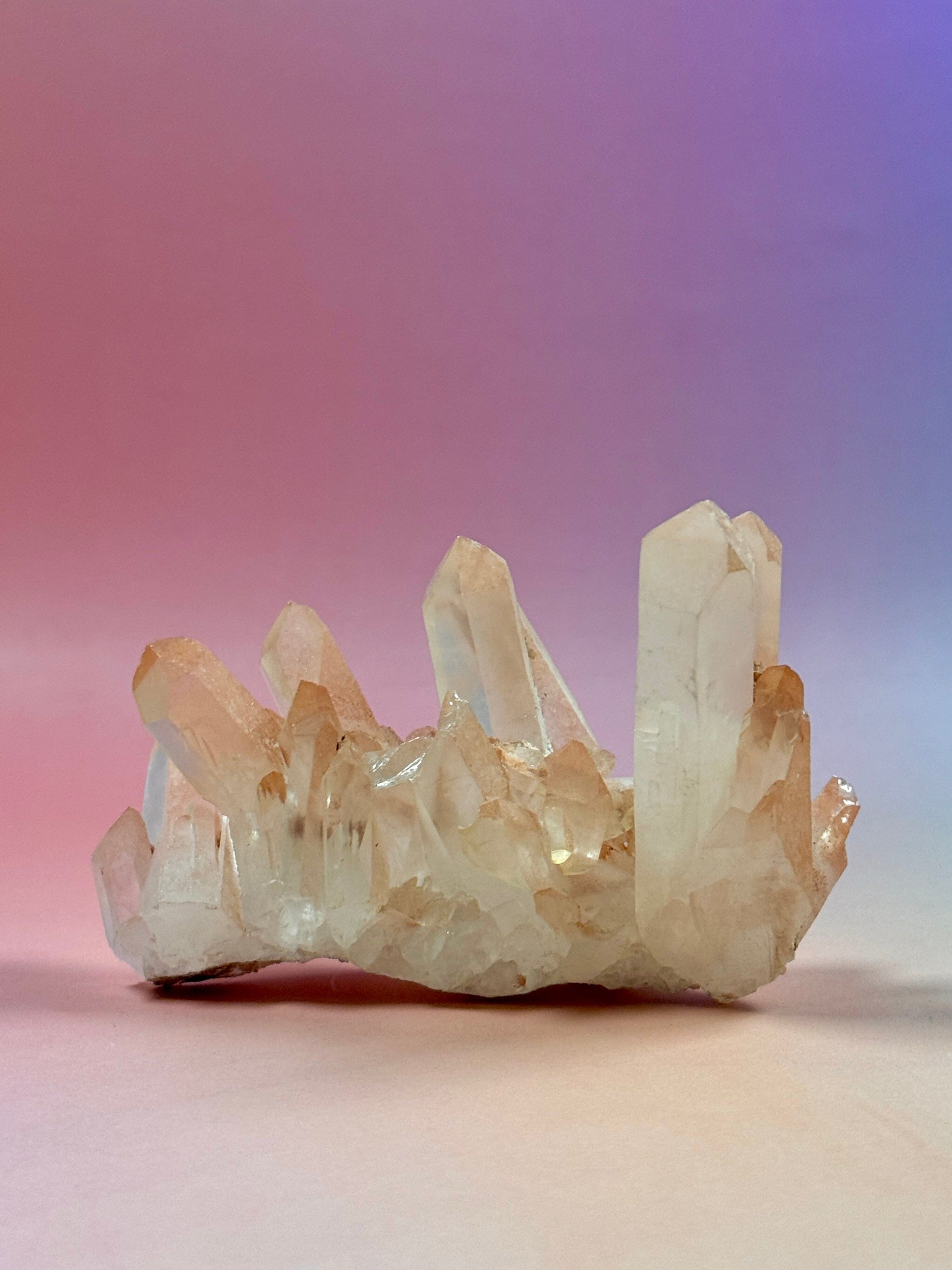This Pink Hematoid Quartz Cluster from Madagascar is naturally coloured by a hematite coating, creating soft blush pink tones with occasional warm yellow and peach hues. Each cluster is unique, displaying beautiful rainbows, subtle hematite shadows, and rich natural details.