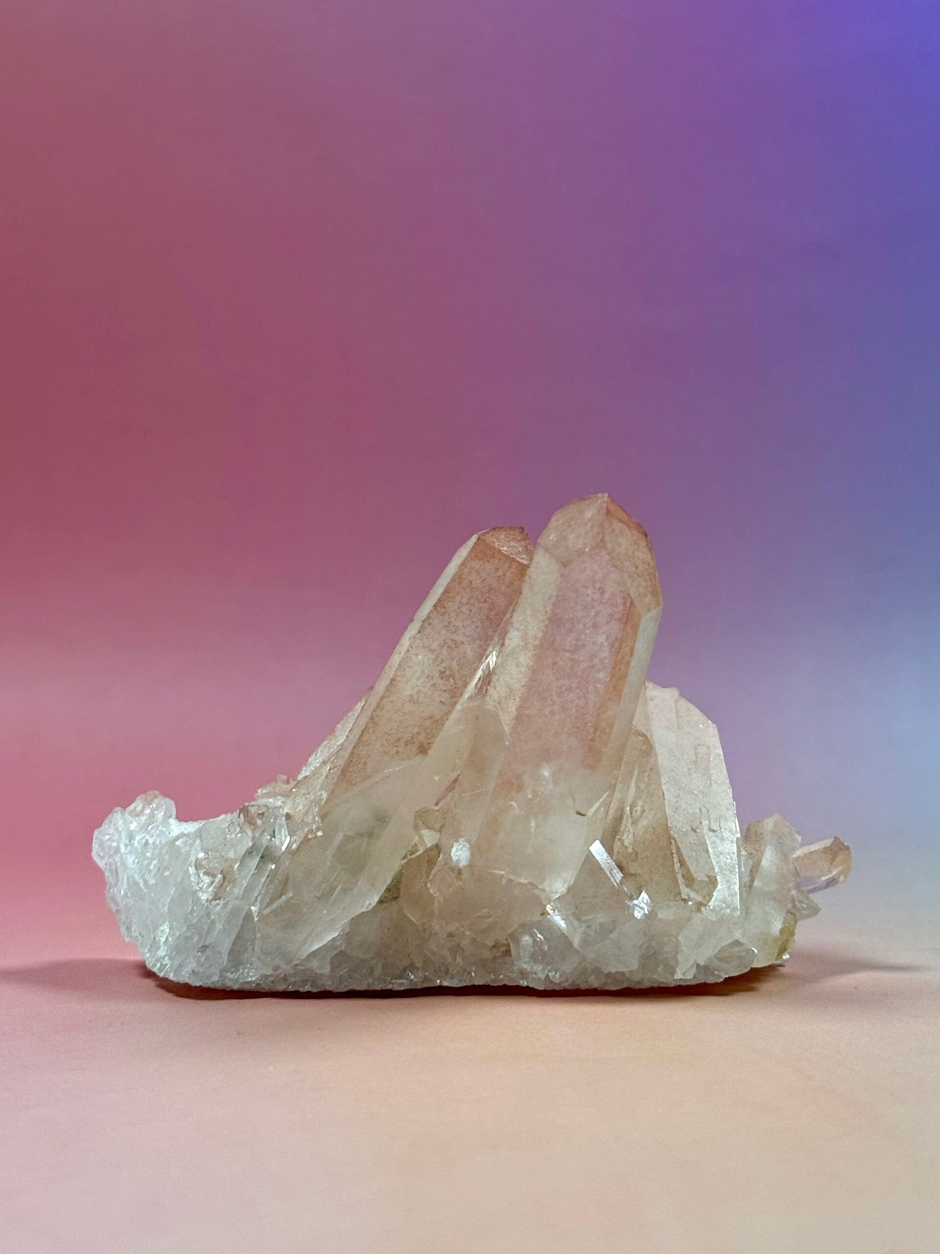 This Pink Hematoid Quartz Cluster from Madagascar is naturally coloured by a hematite coating, creating soft blush pink tones with occasional warm yellow and peach hues. Each cluster is unique, displaying beautiful rainbows, subtle hematite shadows, and rich natural details.