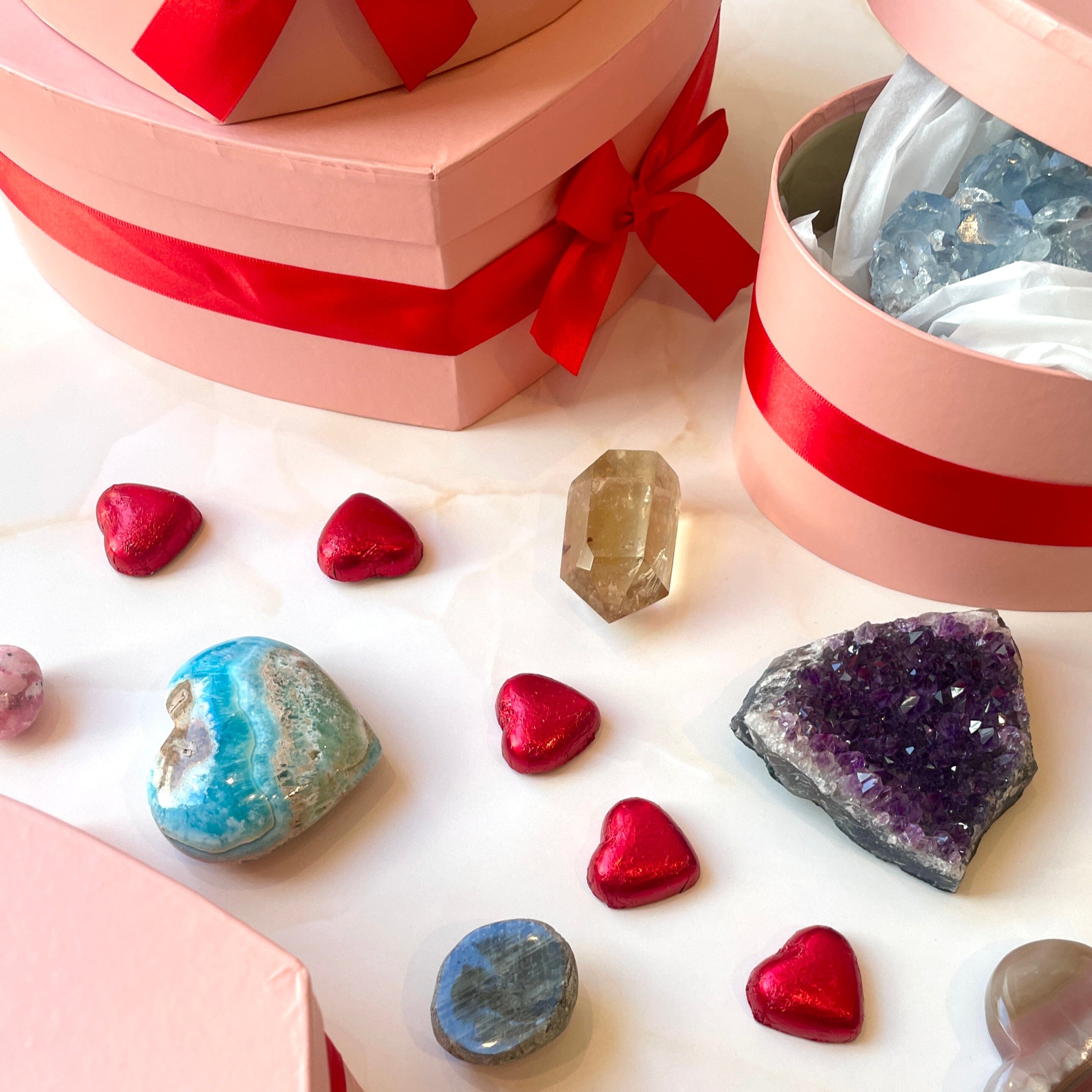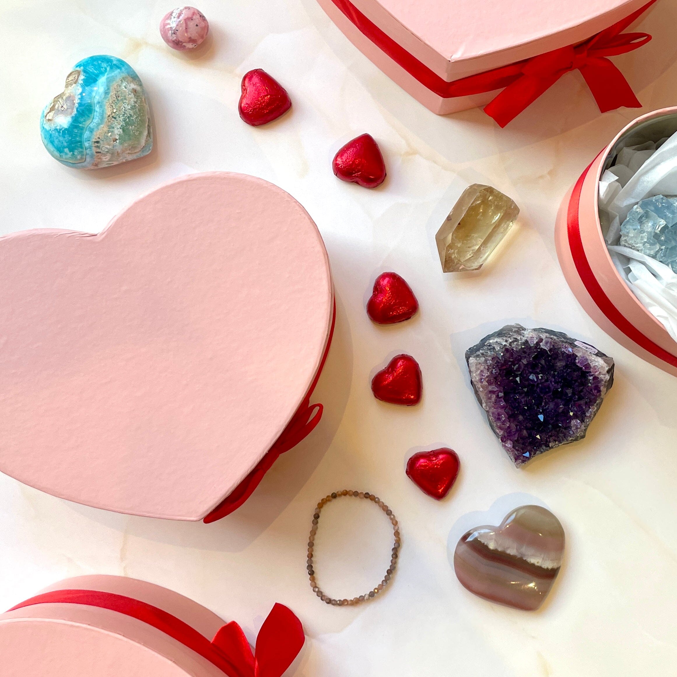 You will receive a beautiful pink heart-shaped Valentine box with red ribbon, filled with crystals and stones that radiates love, all beautifully wrapped in silk paper.