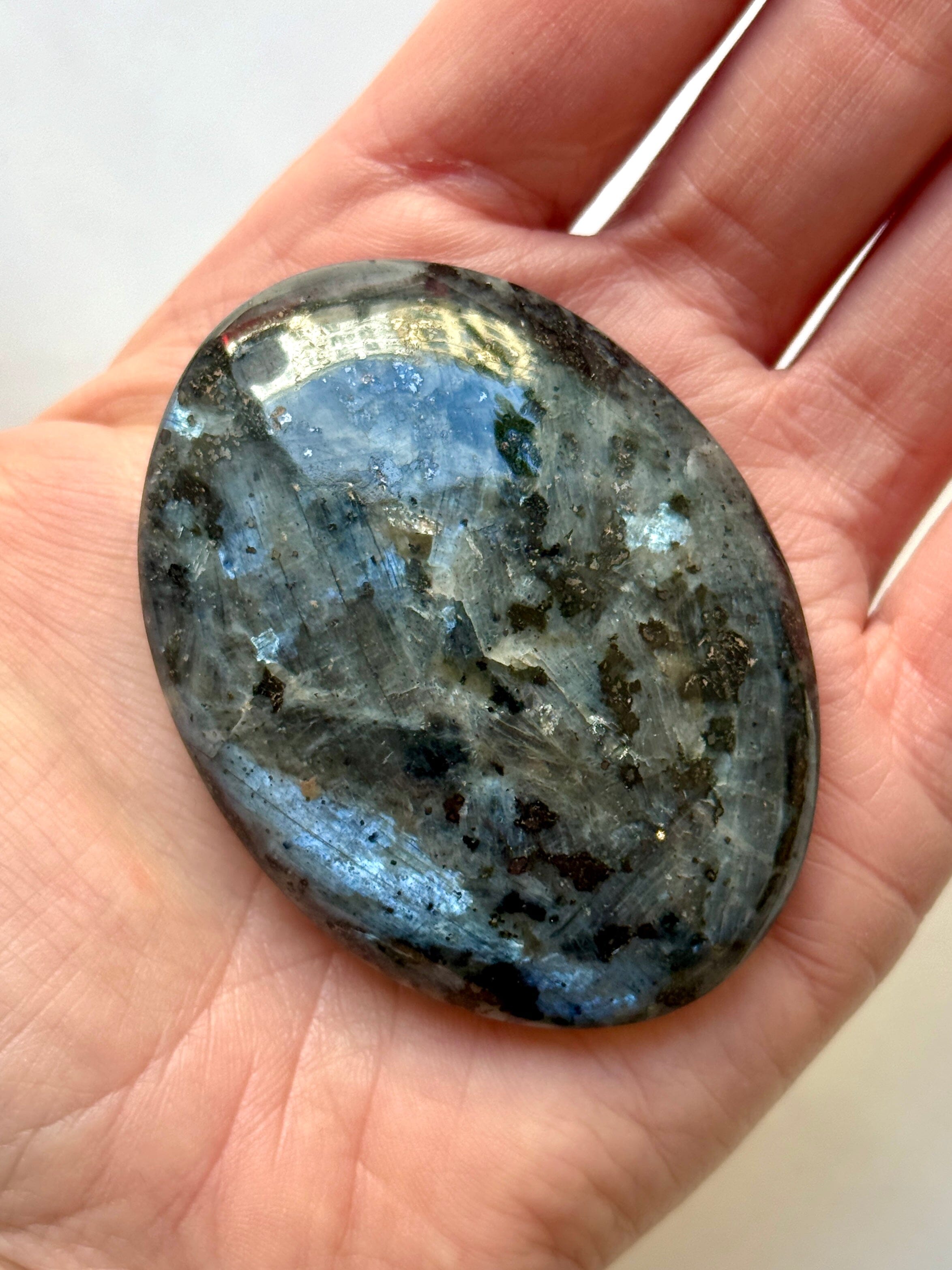 Larvikite is a magical stone named after the Larvik region in Norway, where it can be found in abundance. This iridescent igneous rock is also found in Ontario, Canada and is sometimes known as "Blue Pearl Granite". It shares a close connection to Labradorite, another powerful crystal known for its stunning iridescence. Similar to its counterpart, Larvikite is believed to enhance metaphysical abilities and intuition by connecting us to our higher selves. It also serves as a powerful protector against negative energies. This stone is especially beneficial for those seeking to expand their knowledge and understanding, allowing us to see things from a higher perspective and integrate new experiences. Additionally, it aids in emotional healing and guides us through necessary endings. With Larvikite, new pathways for knowledge and growth are illuminated, leading us towards new opportunities.