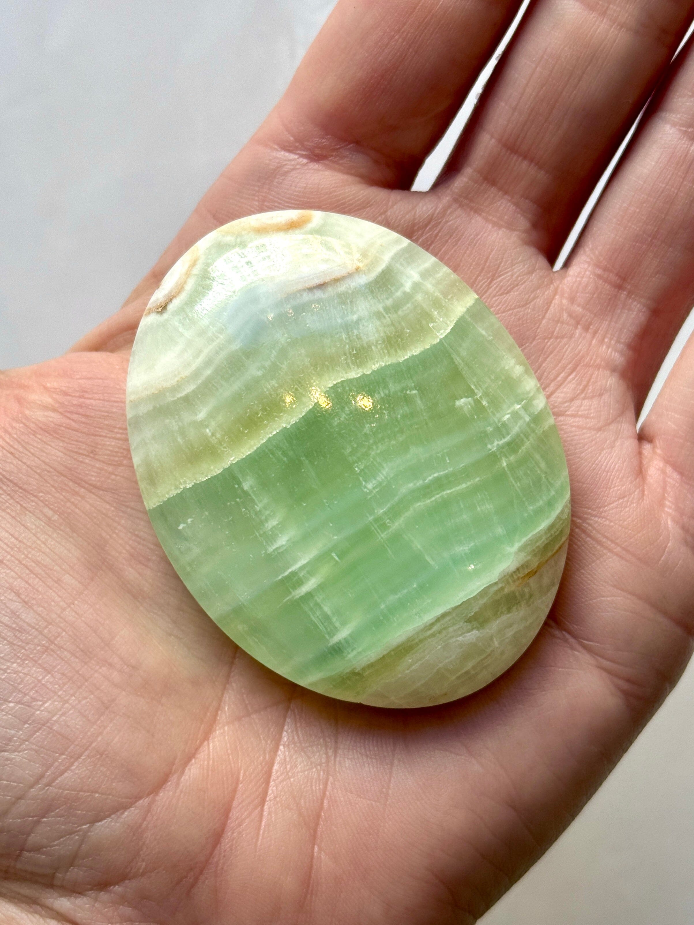 Pistachio Calcite brings a powerful healing energy. Here in a beautiful Palm stone, great for meditation.