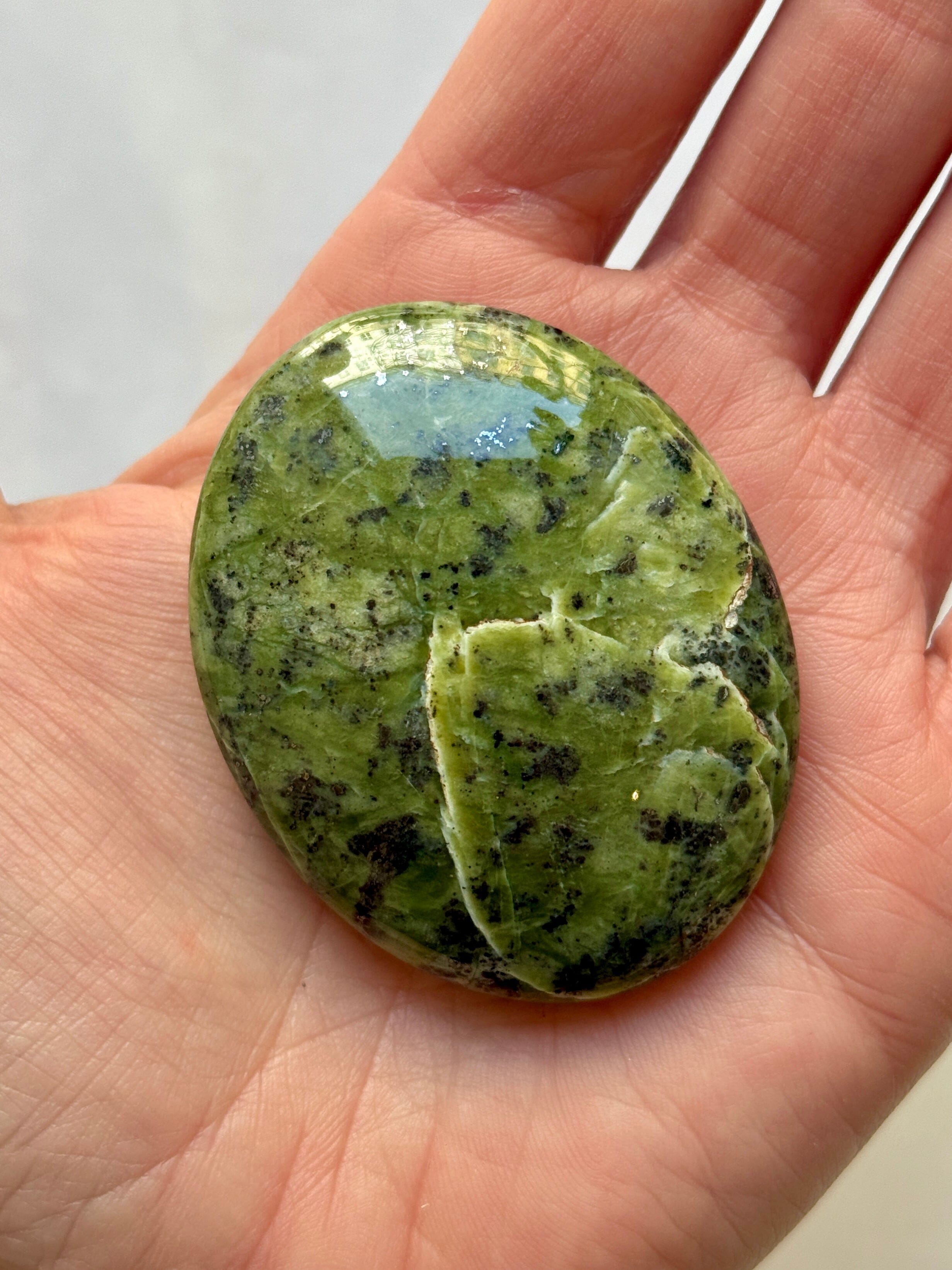 Dark Serpentine Palm stone in a beautiful deep green color.