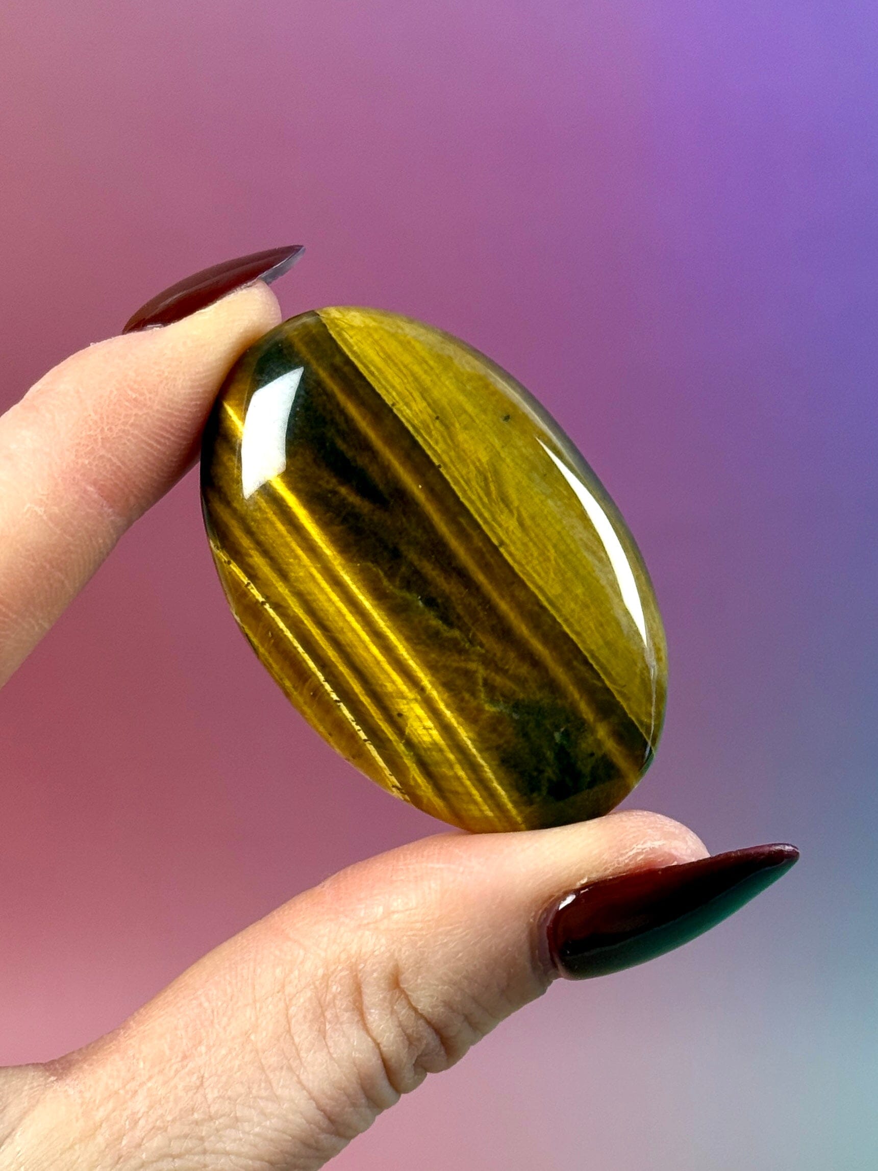 Tigers Eye Palm stone of high quality with beautiful flash.