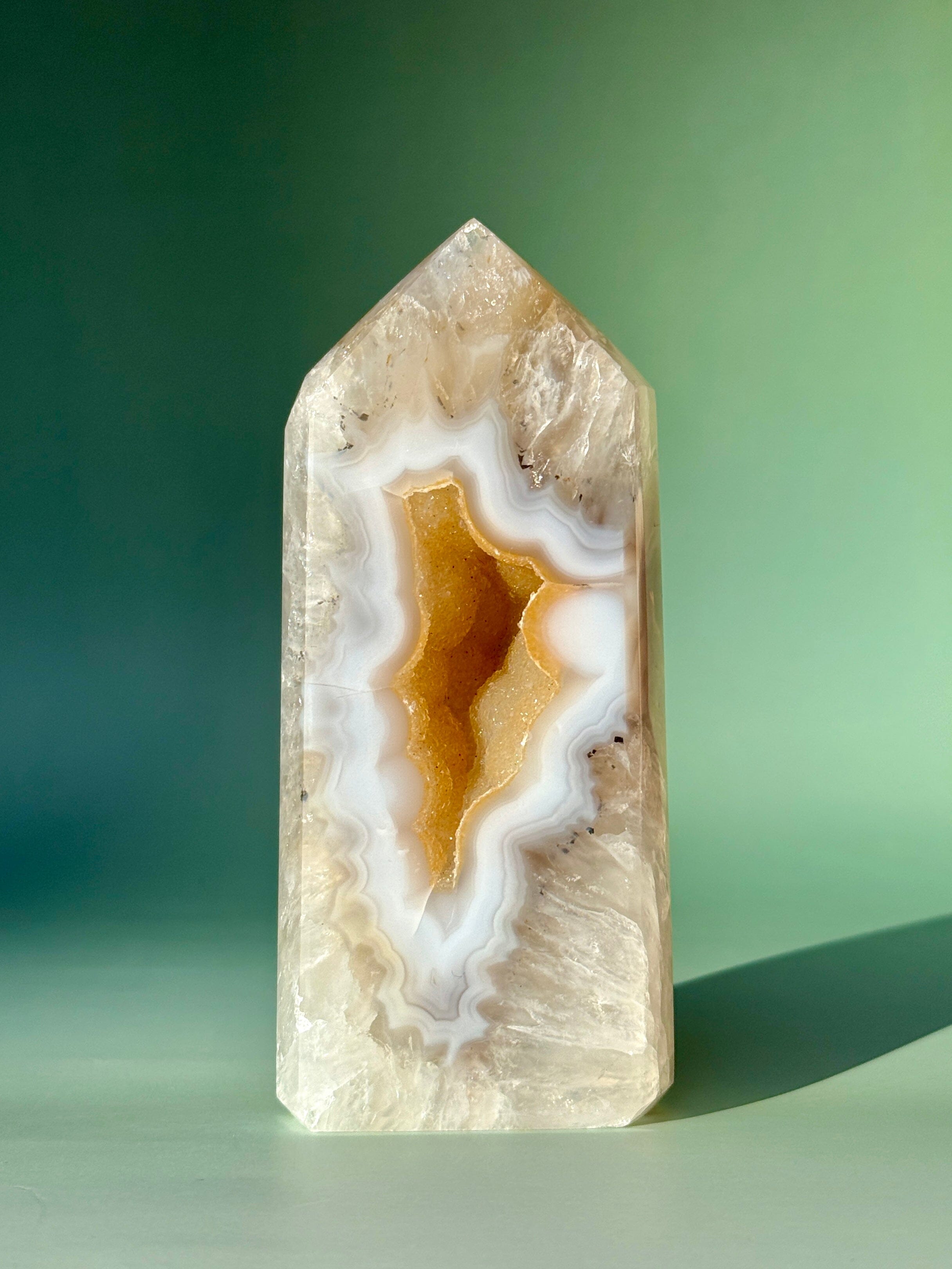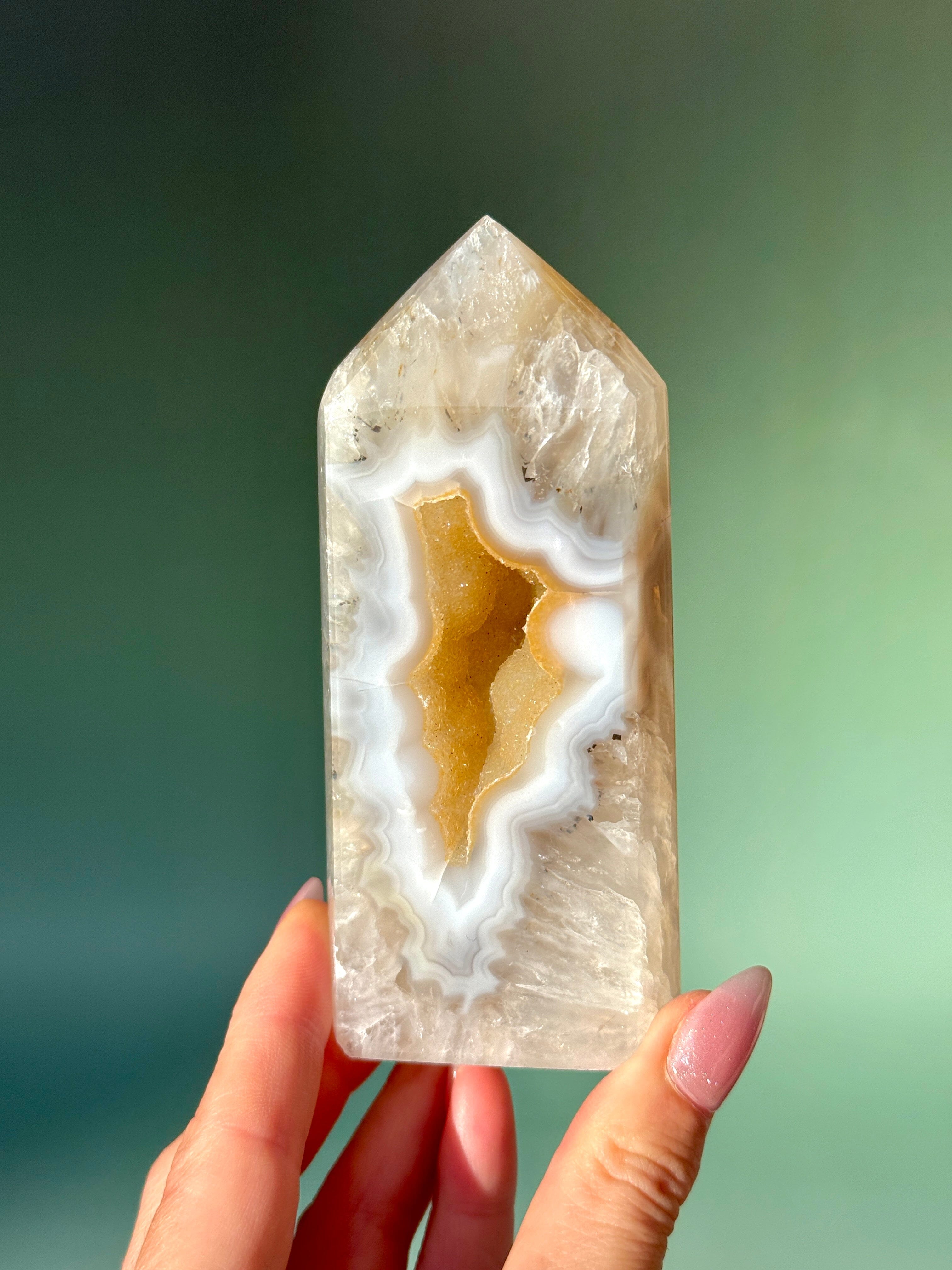 Druzy Agate tower in extra high quality from Brazil. This fascinating glittery crystal represents the divine beauty of Mother Earth.