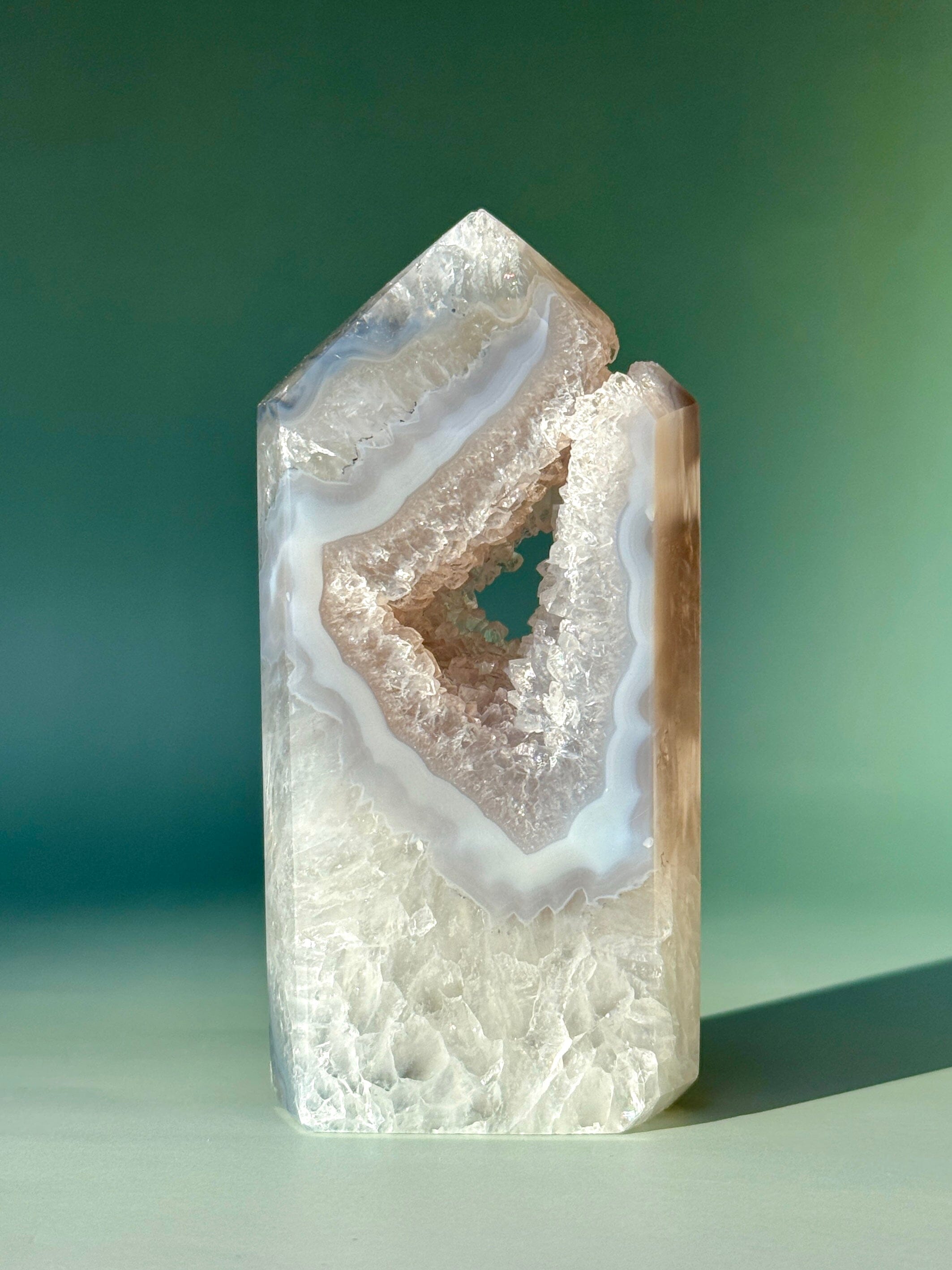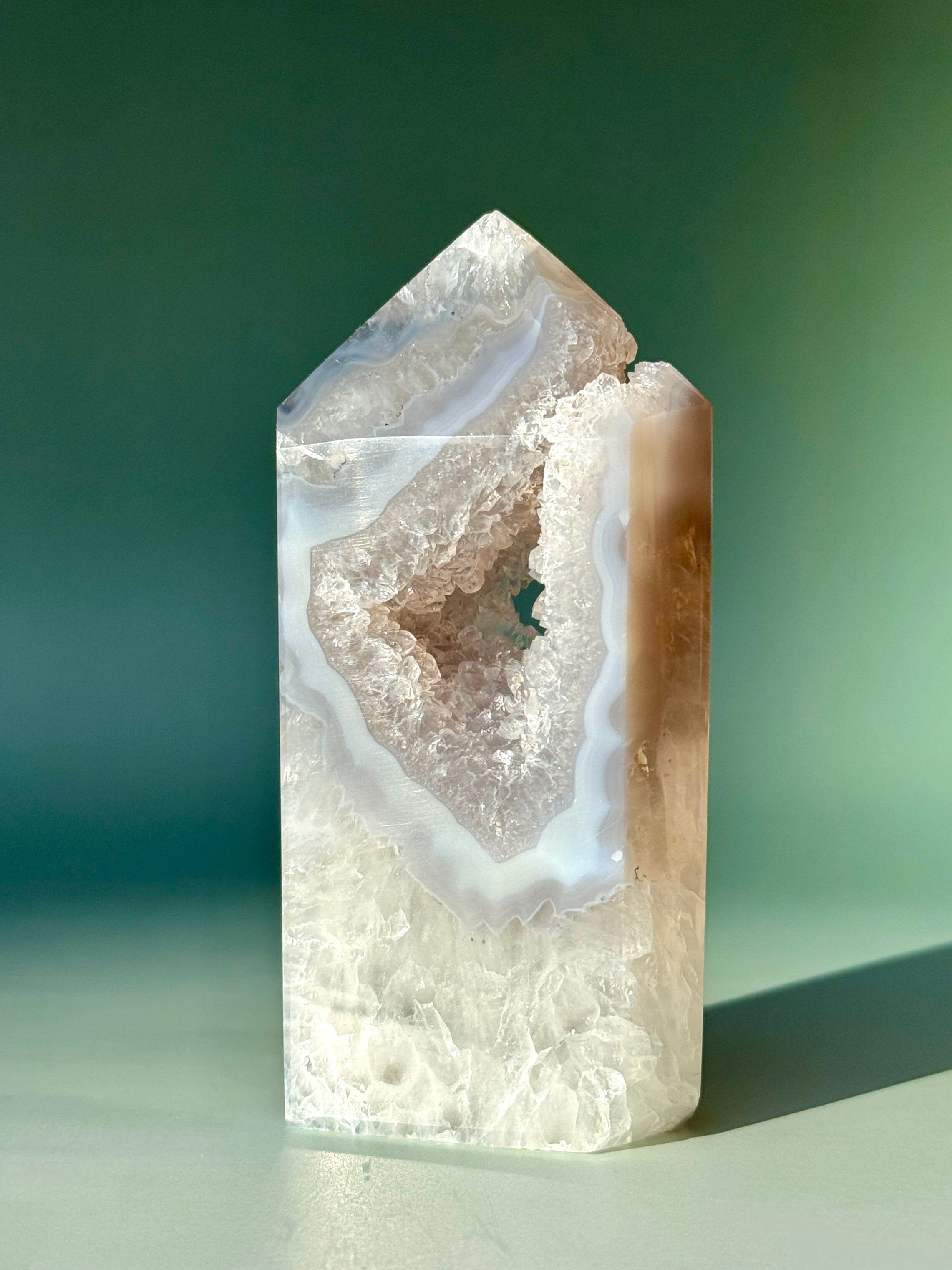 Druzy Agate tower in extra high quality from Brazil. This fascinating glittery crystal represents the divine beauty of Mother Earth.
