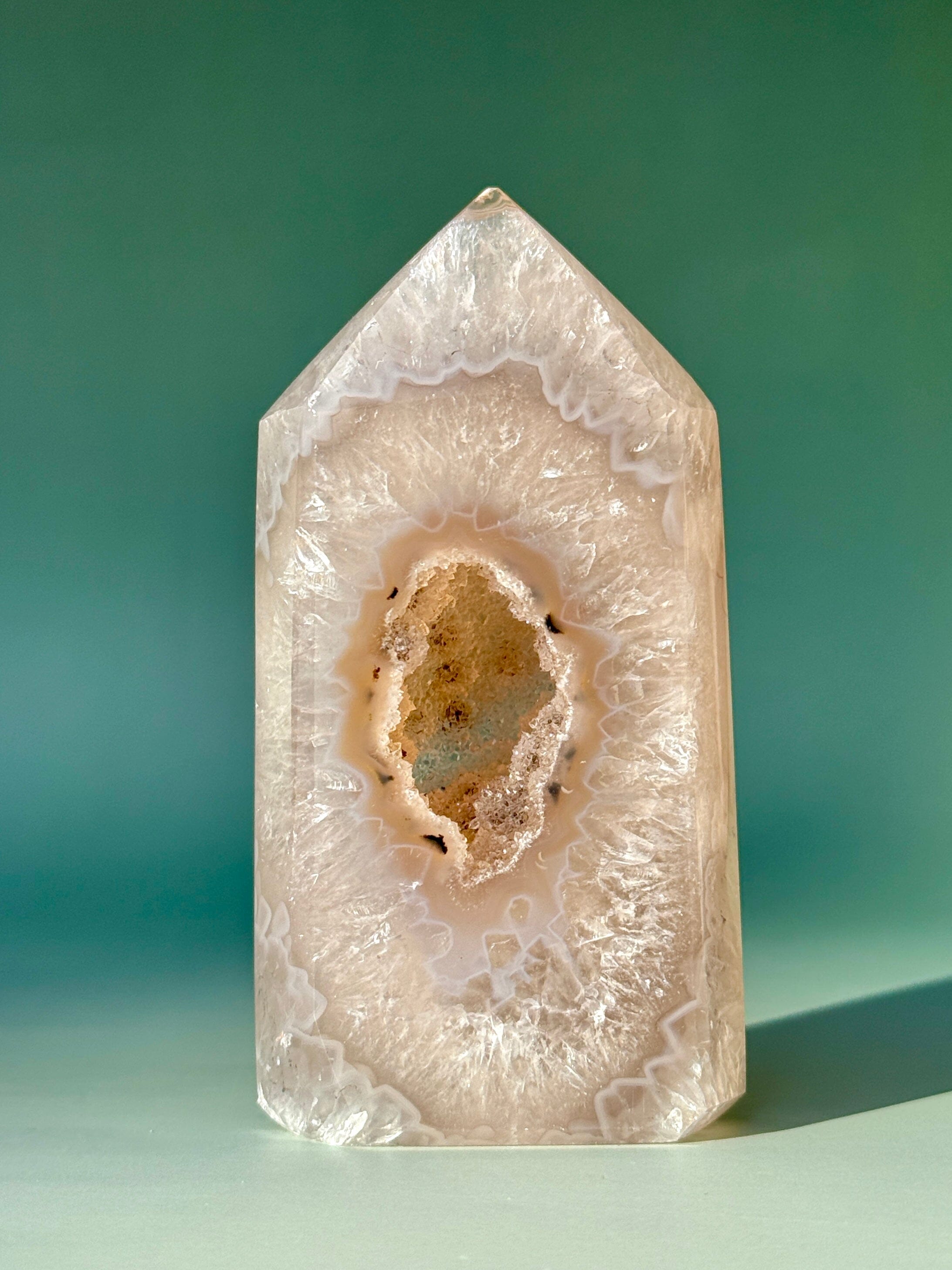 Druzy Agate tower in extra high quality from Brazil. This fascinating glittery crystal represents the divine beauty of Mother Earth.