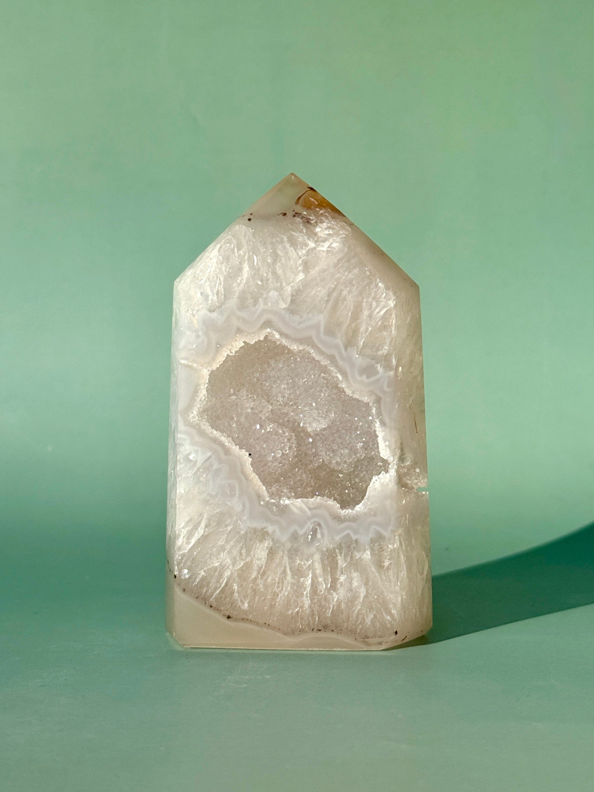 Druzy Agate tower in extra high quality from Brazil. This fascinating glittery crystal represents the divine beauty of Mother Earth.