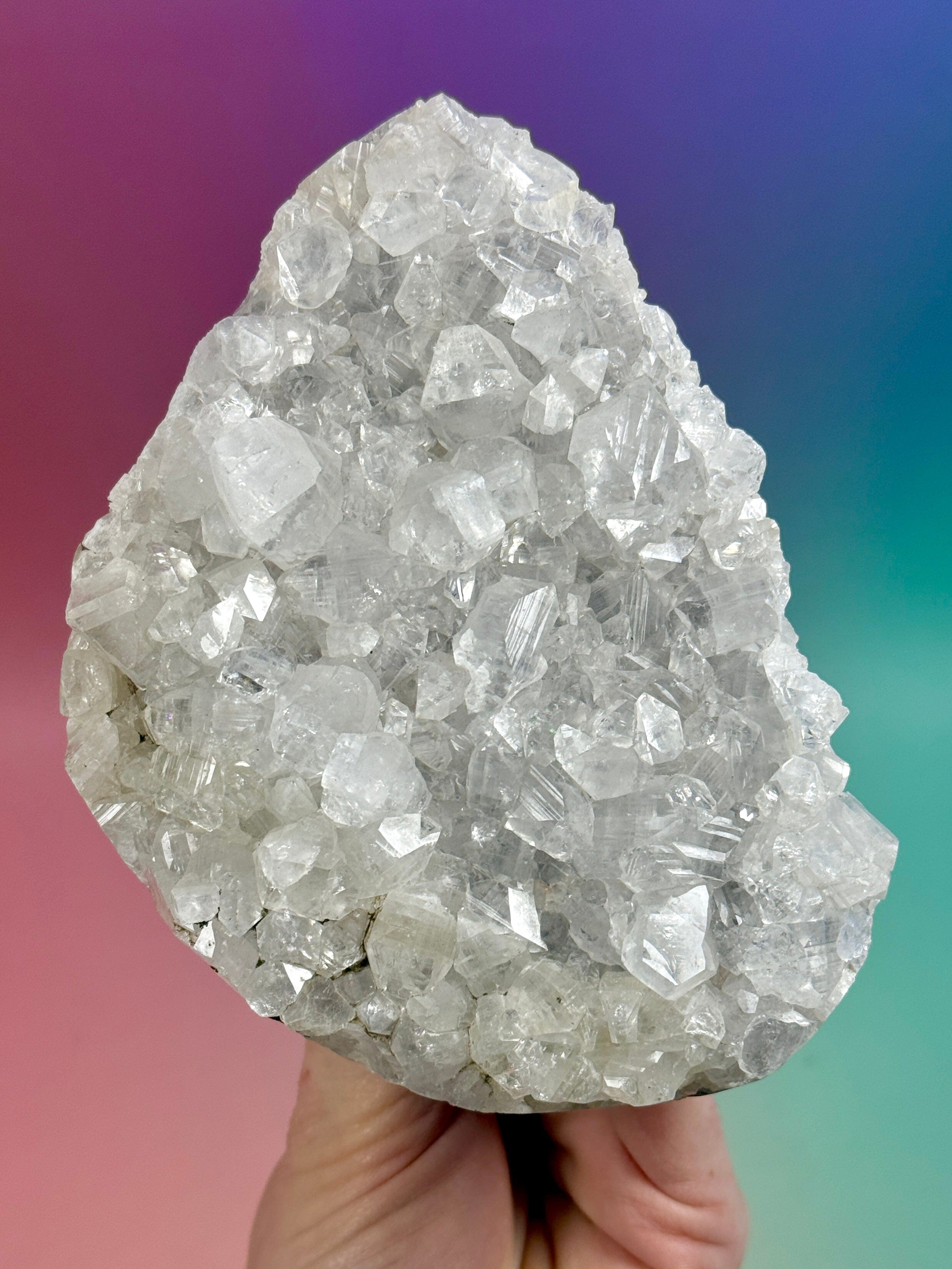 Fra det hellige område i Nordindien kommer denne lysende Apophyllit – en krystal af ren spirituel klarhed.